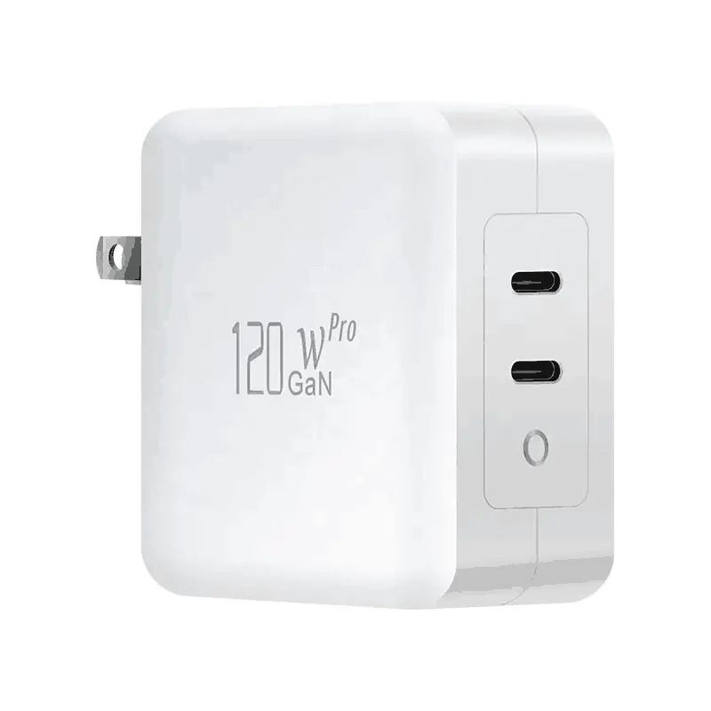 Adaptateur de charge rapide compact avec deux ports USB-C, offrant une puissance totale allant jusqu'à 120 W pour ordinateurs portables, tablettes et autres appareils électroniques.